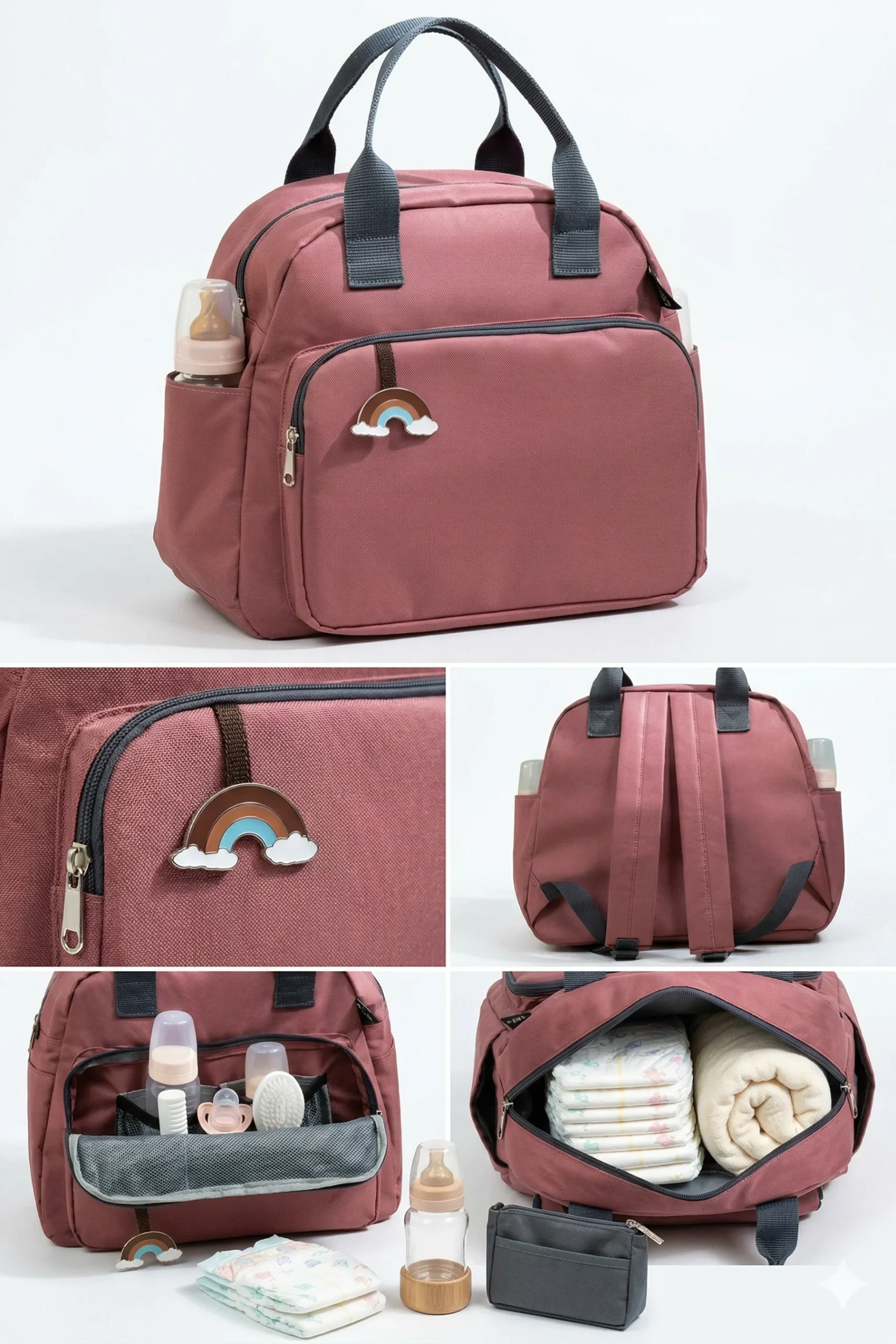 Anne ve babaların en büyük yardımcısı olacak Elite Mila Çok Fonksiyonlu Bebek Bakım Çantası, şık pembe rengi ve sevimli gökkuşağı detayıyla dikkat çekiyor. Sadece bir çanta değil, bebeğinizle çıktığınız her gezintide düzeni sağlayan bir organizatör.