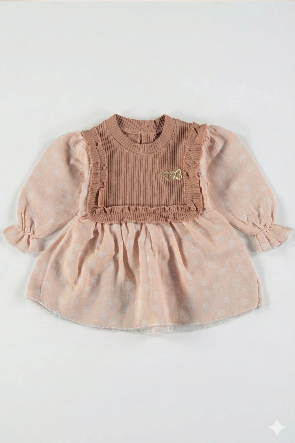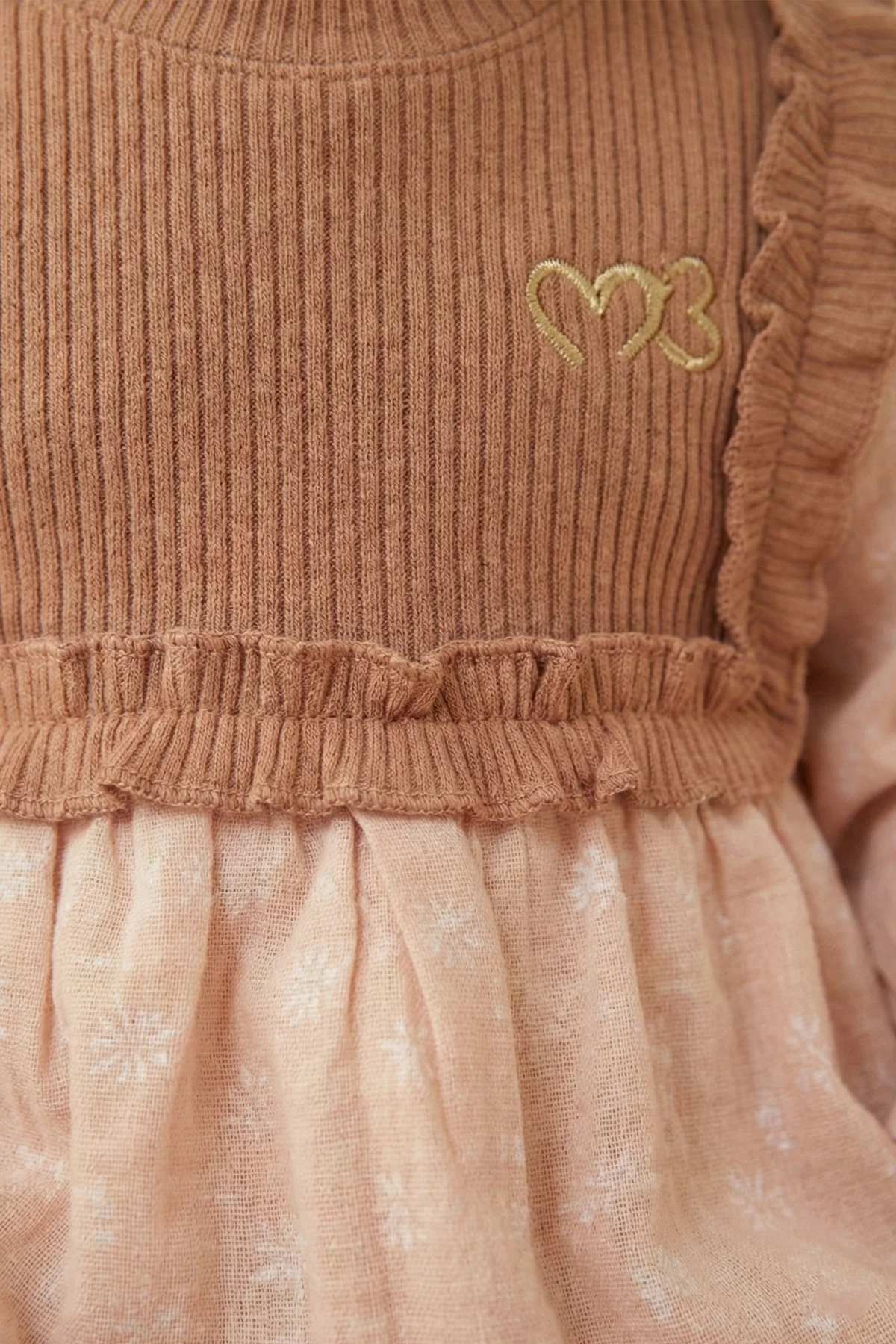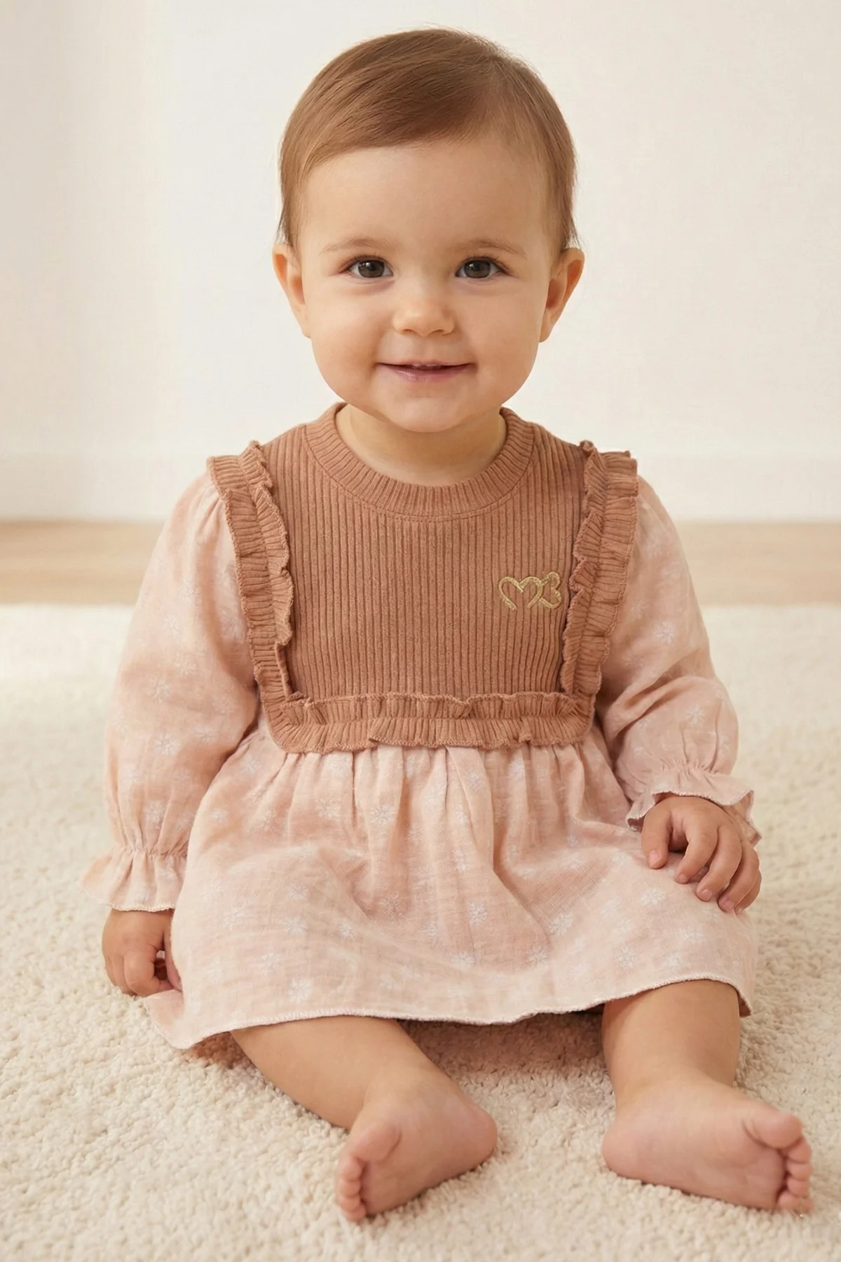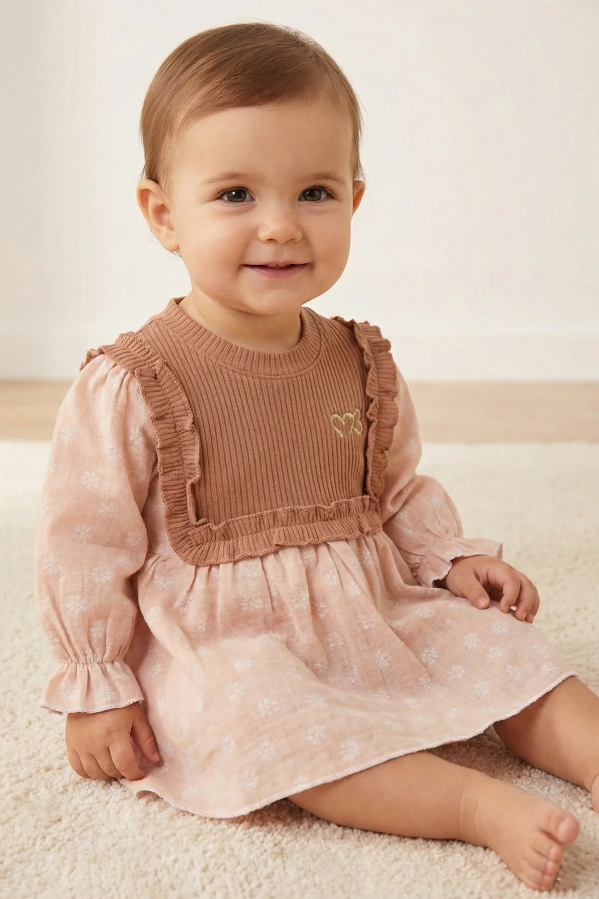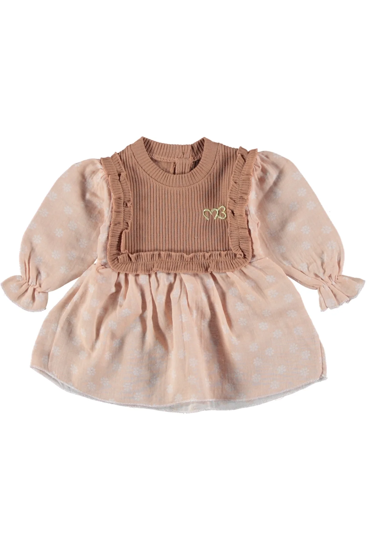 Minuma’nın toprak tonlarından ilham alan bu özel tasarımı, miniklerin stiline sıcak bir dokunuş katıyor. Üst bedeni saran esnek fitilli (ribana) kumaş, bebeğinizin hareket özgürlüğünü desteklerken; etek ve kollardaki %100 pamuklu müslin kumaş, üzerindeki zarif beyaz çiçek desenleriyle masalsı bir görünüm sunar.